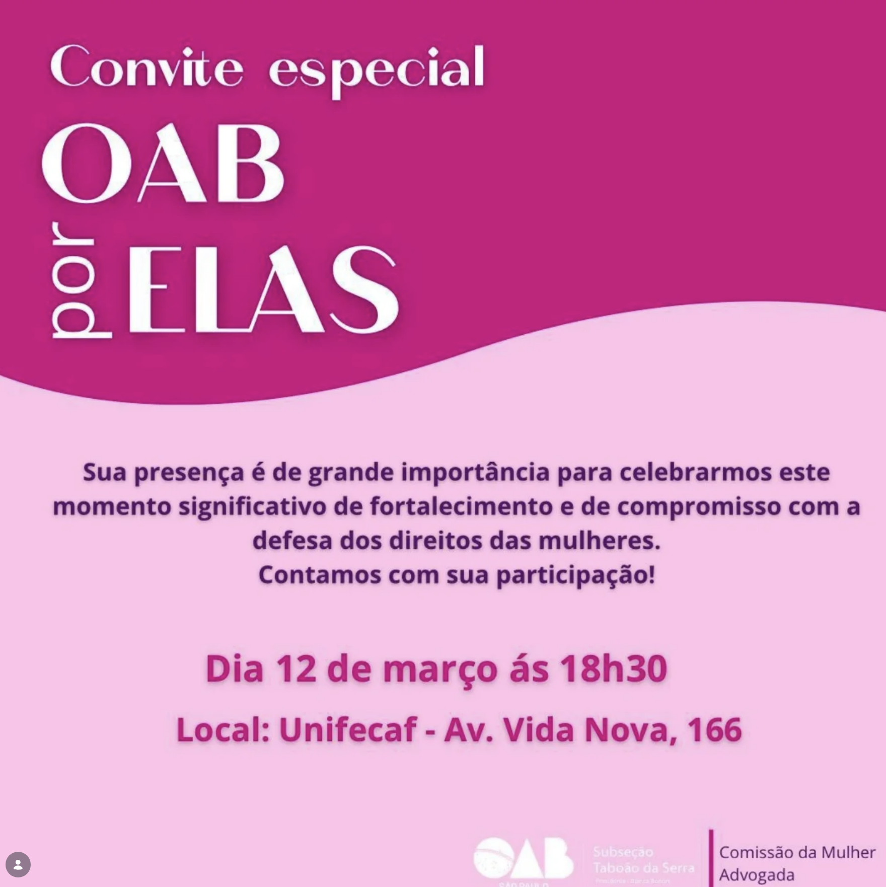 A OAB Taboão da Serra por meio da Comissão da Mulher Advogada, tem a honra de convidar Vossa Senhoria para a Inauguração do Projeto “OAB por Elas”.