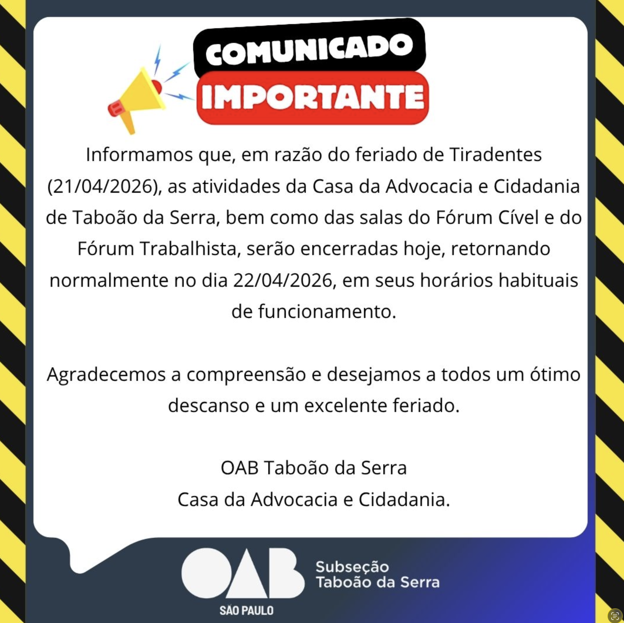 Informamos que, em razão do feriado de Tiradentes (21/04/2026), as atividades da Casa da Advocacia e Cidadania de Taboão da Serra, bem como das salas do Fórum Cível e do Fórum Trabalhista, serão encerradas hoje, retornando normalmente no dia 22/04/2026, em seus horários habituais de funcionamento.