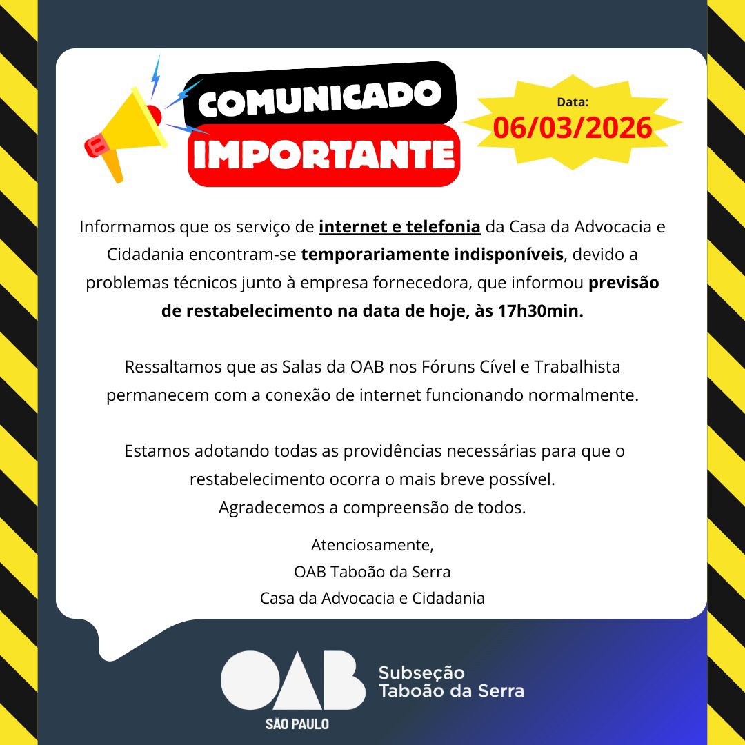 Comunicado: Serviço de internet e telefonia da Casa da Advocacia e Cidadania indisponíveis